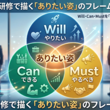 3つの円が重なる部分——「やりたい × できる × やるべき」の交点——が、最も実現可能性が高く、かつ意味のある「ありたい姿」となります。管理職研修ではこの3つの観点から「ありたい姿」を問い直す時間を取ることで、参加者が自分自身のビジョンを明確化できます。